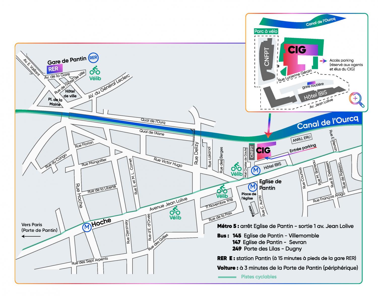 Le CIG petite couronne est situé à Pantin, entre l'avenue Jean Lolive et le canal de l'Ourcq, à 3 minutes en voiture du boulevard périphérique de Paris (sortie Porte de Pantin). On peut facilement y accéder par transports en commun.