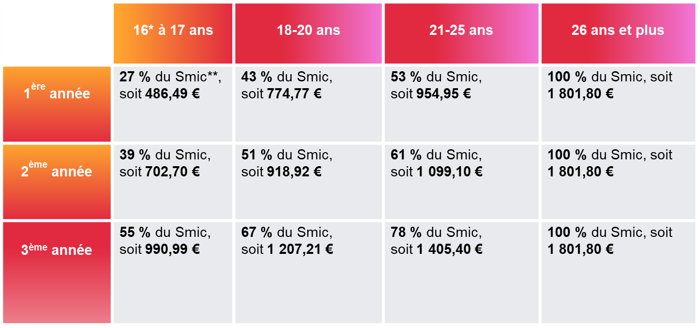 *Les apprentis de moins de 16 ans bénéficient de la même rémunération que les apprentis âgés de 16 à 17 ans.
