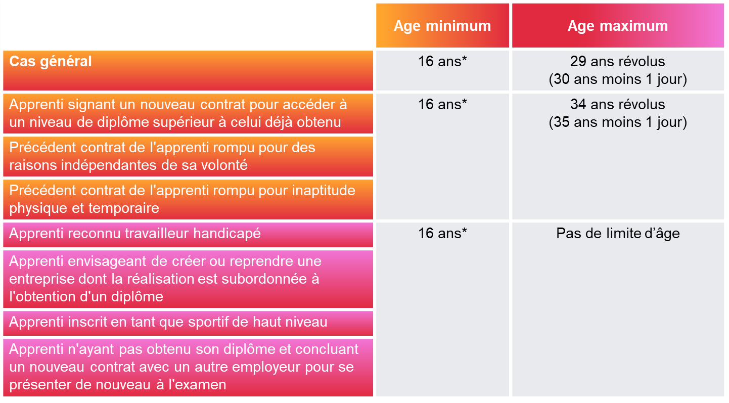 L’apprenti doit avoir au moins 16 ans à la date de la signature du contrat d’apprentissage. Toutefois, il est admis qu’un jeune âgé d’au moins 15 ans révolus puisse débuter un contrat d’apprentisage à condition d’avoir effectué sa dernière année de collège.