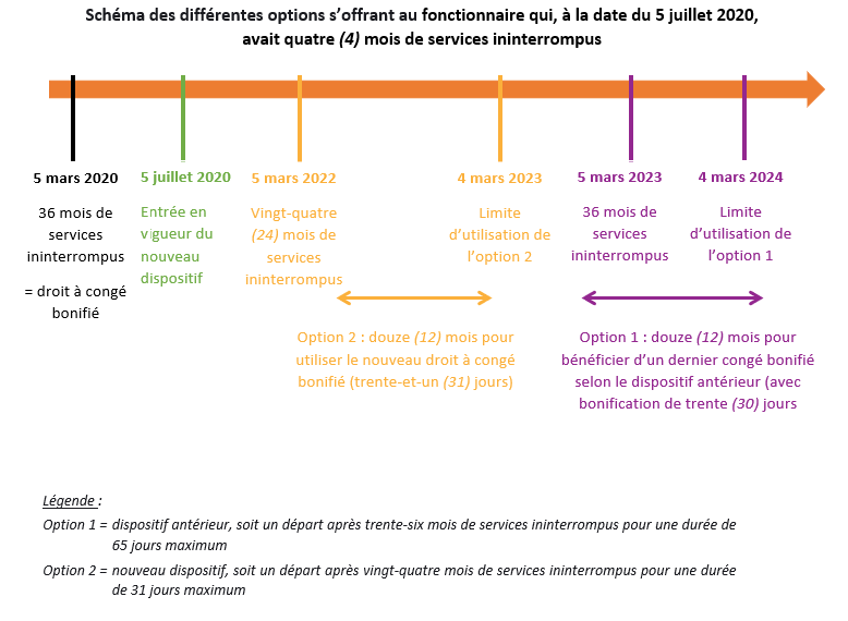 Exemple : Le fonctionnaire qui, à la date du 5 juillet 2020, avait quatre (4) mois de services ininterrompus (dernier droit de congé bonifié ouvert le 5 mars 2020 après trente-six (36) mois de services ininterrompus) avait comme option de :