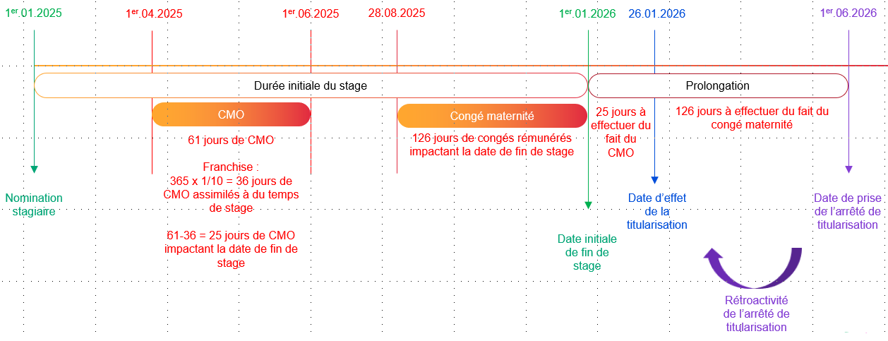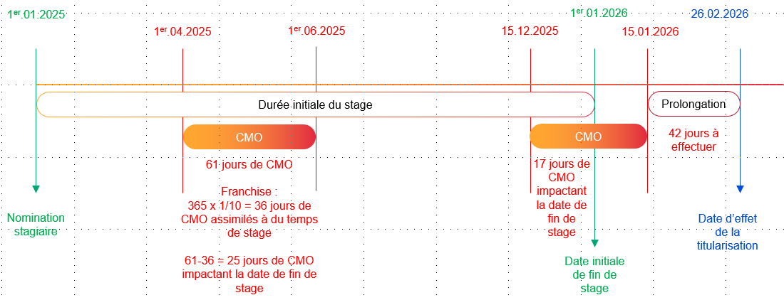 Exemple : Un agent est nommé stagiaire le 1er janvier 2025 pour une durée d’un an à temps plein. Il est placé en congé de maladie ordinaire (CMO) du 1er avril 2025 au 31 mai 2025 inclus, puis du 15 décembre 2025 au 14 janvier 2026 inclus.