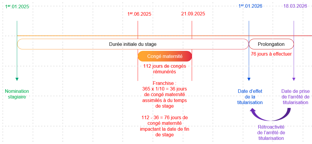 Exemple : Une agente est nommée stagiaire le 1er janvier 2025 pour une durée d’un an à temps plein. Elle est placée en congé de maternité du 1er juin 2025 au 20 septembre 2025 inclus.