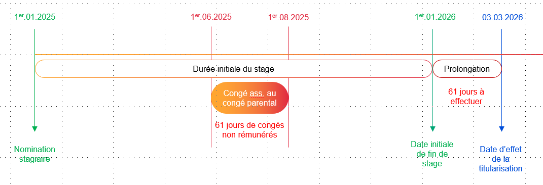 Exemple : Un agent est nommé stagiaire le 1er janvier 2025 pour une durée d’un an à temps plein. Il est placé en congé assimilable au congé parental du 1er juin 2025 au 31 juillet 2025 inclus.