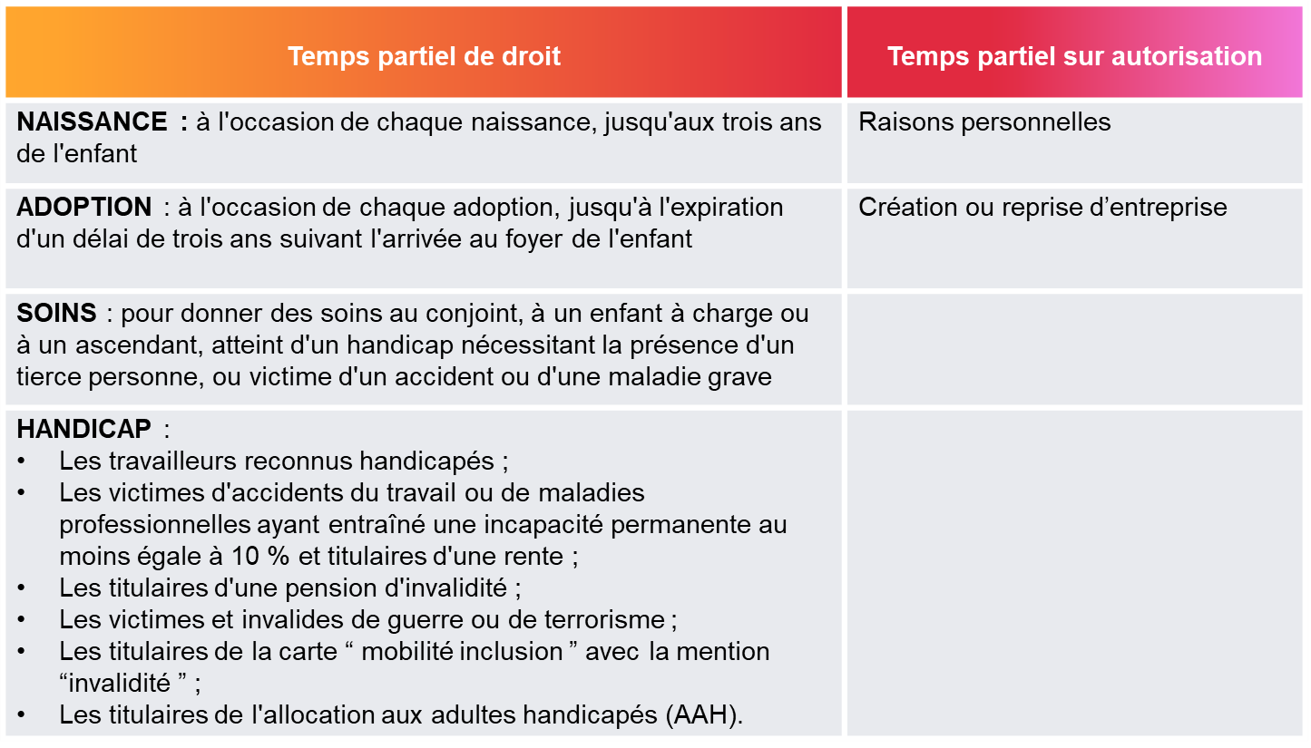 Tableau récapitulatif des différentes formes de temps partiel :
