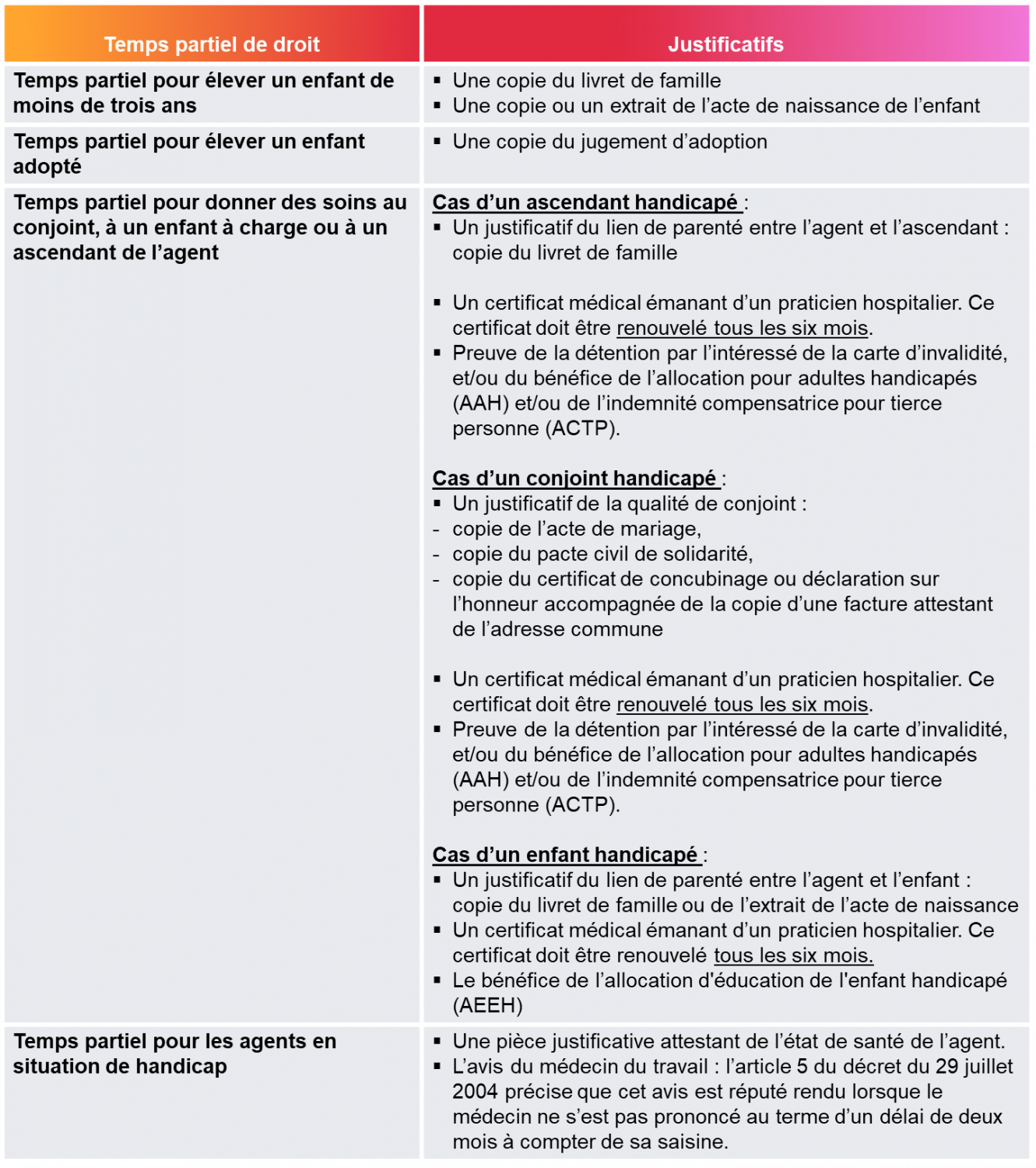 Les pièces justificatives à joindre à la demande de temps partiel de droit :