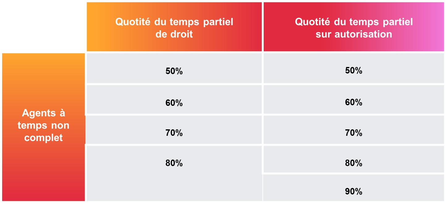 Il faut tenir compte de la nature de l’emploi, c’est-à-dire, le temps complet ou le temps non complet (voir question n°1), pour déterminer les quotités de travail admises (voir tableaux infra).